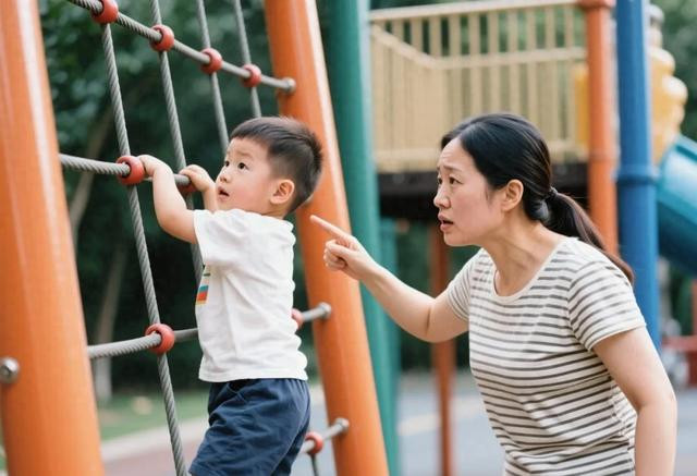 一个5岁左右的小男孩想尝试攀爬架,刚踩上第一根横杆,妈妈立刻冲过去:"别爬了!摔下来怎么办?这么高多危险啊!"孩子犹豫了一下,默默退了回来,坐在旁边的长椅上发呆。